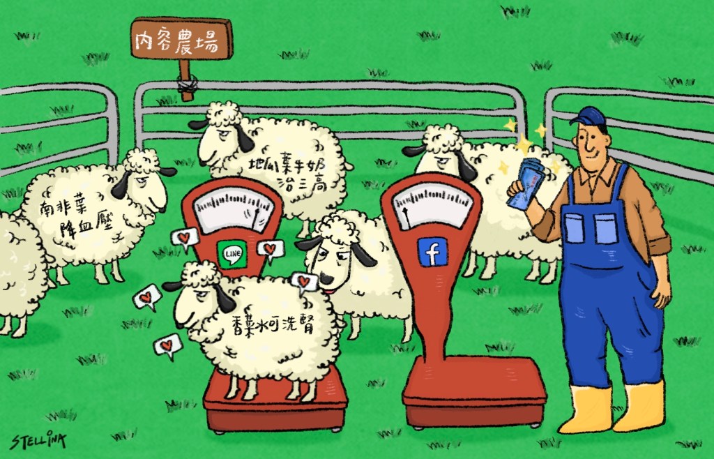歡迎來到圈養眾多肥美羊隻的內容農場,有發現嗎?每隻羊身上都藏著「流量密碼」,羊隻與杜撰出來的假消息,正透過社群平台柵欄口的秤子秤斤論兩(地瓜葉打牛奶治三高、香菜水可洗腎、南非葉降血壓…),而內容農場的商人手上拿著白花花的鈔票。